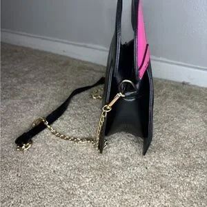 Unique handbag shaped like a retro telephone. Features vibrant pink and gold accents. Perfect for a statement look. A few dirt spots as noted in Photo.