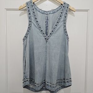 Just as versatile as it is vintage-inspired, this timeless tunic is featured in a sleeveless, denim design with exaggerated stud detailing for added dimension.