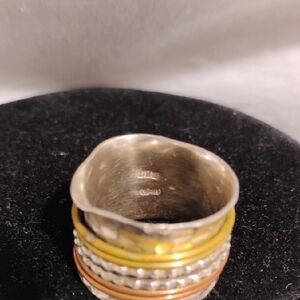 Elegant hammered ring featuring a blend of silver, gold, and copper tones. Perfect for adding a touch of sophistication to any outfit.