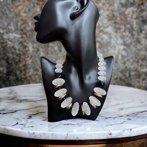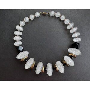 Necklace Matte Clear White faceted beads & balls, black & gold tone beaded 16”.