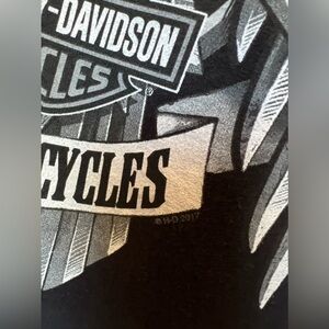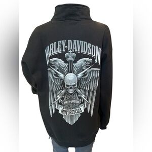 Harley Davidson enthusiast, this men's black sweatshirt in size L celebrates the iconic brand with a bold graphic print featuring the skull and eagle motif. The pullover design, complemented by a convenient 1/4 zip closure.