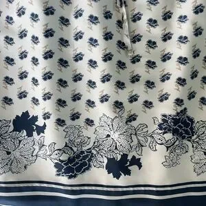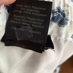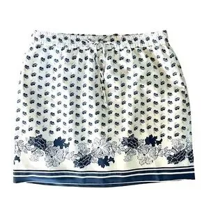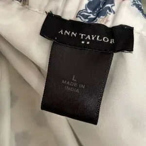 This Ann Taylor skirt is white with blue and taupe floral accents and stripes at the hem. Super soft polyester. Fully lined. Elasticized waistband with tie. Size L. NWOT.