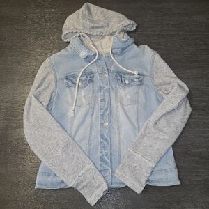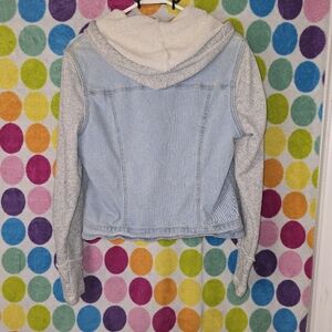 Stylish light blue denim jacket featuring gray knit sleeves and a hood. Perfect for casual outings.