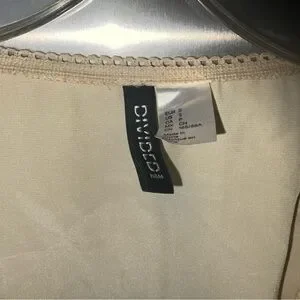 This Divided cream blouse features a fitted silhouette with charming puff sleeves elastic at wrist, offering a touch of elegance to any ensemble. The buttoned front adds a classic, plunging Vee neckline with decorative trim, making it a versatile piece for both casual and formal occasions.