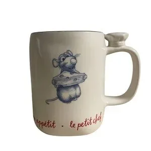 Cream mug featuring Ratatouille holding cheese. Red text accents add charm.