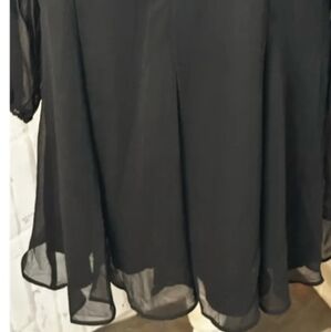 Elegant black fit and flare dress with sheer long sleeves. Button-up front adds a classic touch. Perfect for evening wear. leave a few buttons open or button them all up. Flowing pleats that brush just above the knee