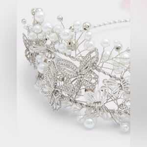 THE PEARL AND JEWEL ENCRUSTED HEADPIECE INSIDE FEATURES WHIMSICAL SILVER BUTTERFLIES AND SATIN TIE CLOSURE FOR A SPELLBINDING FINAL TOUCH