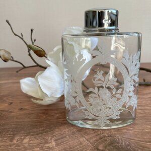 Made in Portugal, by Jay Willfred diu of Andrea by Sadek. This is the medium size of what was sold as a three-piece set. It is decorated with spectacular etched glass floral medallion prints. It has a chrome screws top.