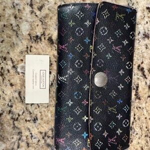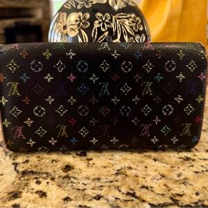 Discover the elegance of the Louis Vuitton Multicolor Monogram Wallet. This stylish accessory features a vibrant multicolor design on a classic black background, perfect for adding a touch of luxury to your everyday essentials. Good condition no peeling.