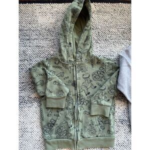Includes green zip up hoodie, grey hoodie and matching sweatpants, yellow Crewneck sweatshirt (this is a 5T) and a yellow “You’ve Got a Friend in me” tee shirt (this has two small paint stains on the back - throwing this in for free)