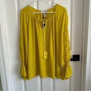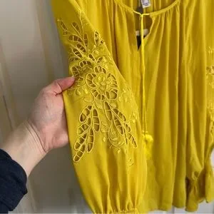 Brighten your wardrobe with this flowy yellow blouse. Featuring elegant embroidered sleeves, it's perfect for any occasion.