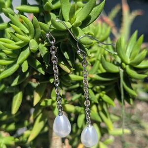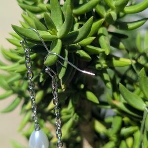 These elegant silver pearl drop earrings add a touch of sophistication to any outfit. Perfect for both casual and formal occasions.