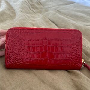 Elegant red croc embossed wallet by Strathberry. Features a sleek design with gold accents. Never been used.