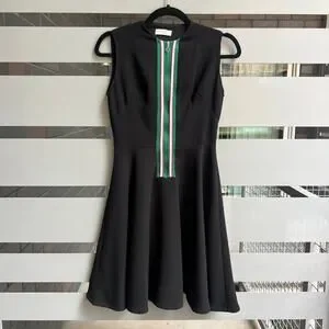 Sandro Paris 'Ines' black athleisure stripe zip-front tennis mini dress. Sleeveless with crew neckline. Front zip detail with sporty stripes. Skater skirt. In excellent condition. Size XS - 16" pit to pit, 13" waist, 26" length from pit, 34" total dress length.