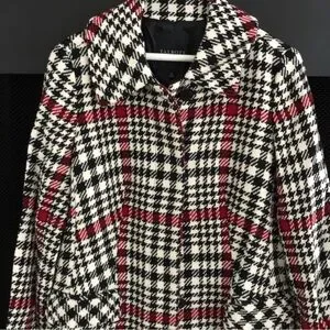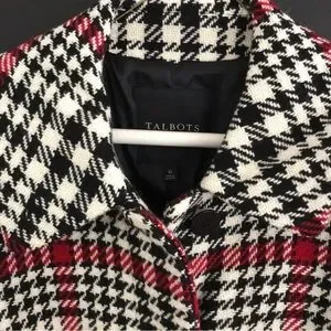 This Talbots trench coat features a striking plaid pattern in black, white, and red, complemented by a muted green tone. Its long length and wide lapels offer a timeless, vintage-inspired look, perfect for staying stylish and warm during the colder months.