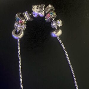 This fun Brighton necklace features a silver chain with beautiful multicolor accents. It has a butterfly charm in the center that has rhinestones on the front and says ‘Free to Fly’ on the back. It has a cute heart shaped clasp. It is adjustable!☺️ Perfect for any occasion.