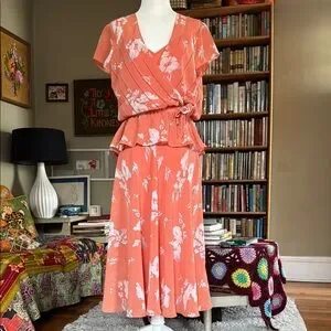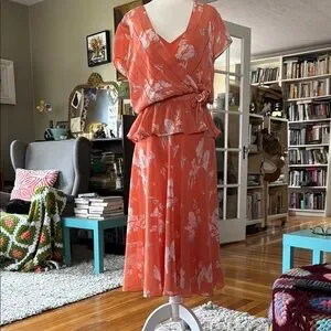 Albert Nipon Coral Dress with White Floral Pattern