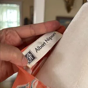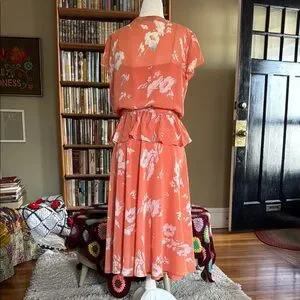 Vintage three-piece ensemble consists of a slip, blouse and skirt by Albert Nipon. Coral silk with subtle white and blue floral design. Blouse has beautiful open work details and a peplum. Skirt is cut on a bias. An 80s does 30s style that would make a great wedding guest outfit. Wear with a wide brimmed hat and you are guaranteed to turn heads. Marked Size 10 but fits my Size 4 dress form perfectly.