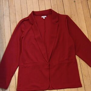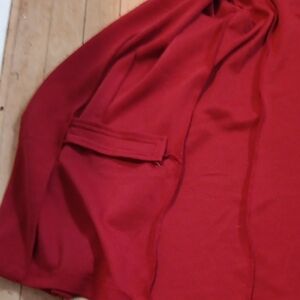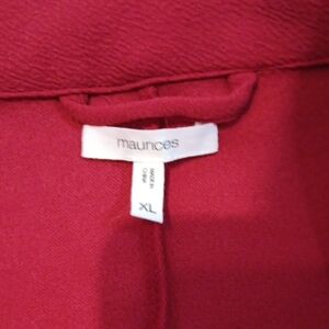 This Maurices blazer in a striking red hue offers a sophisticated and tailored look, perfect for elevating any outfit. With its notched lapel collar and long sleeves, it combines classic style with modern elegance. The textured fabric adds a unique touch, making it a versatile addition to your wardrobe. Unfortunately the pockets are fake