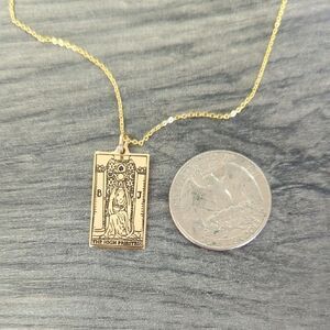 Elegant gold tone tarot card pendant necklace featuring intricate designs. Perfect for adding a mystical touch to any outfit.