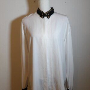 Add a touch of vintage charm to your wardrobe with this Tess dressy blouse. The high neck and classic/fitted long sleeves give it a timeless look. The collarless blouse features a button front and braiding accents that add a unique touch. Made from a blend of polyester, braiding, and rayon, it is comfortable and durable. This blouse is perfect for any occasion and can be dressed up or down. The blouse is available in size L and comes in a solid white color. The blouse is a basic style with a 70s theme and is perfect for any fashion-conscious woman.