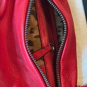 Stylish red leather belt bag with adjustable strap. Perfect for hands-free convenience and a touch of elegance.