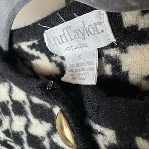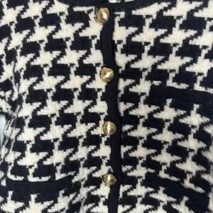 Either a cropped style or possibly shrunk in a dryer a tad, size small. Cute houndstooth pattern with gold buttons. Merano wool
