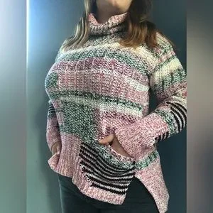 A fantastic high neck knit multi color pink sweater. It has a cute front pocket and has a high low hem. Very cozy and comfy!