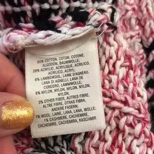 55% Cotton, 28% Acrylic, 6% Lambswool, 6% Nylon, 3% other fibers, 1% Wool, 1% Cashmere