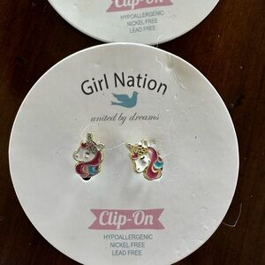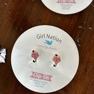 New, Adorable clip-on earrings set for kids. Features a variety of playful designs in vibrant colors. Perfect for adding a fun touch to any outfit. Girl Nation Clip On earrings, new. Paid $19.99 for each on Girl Nation website. Will include 4 pairs of handmade clip on earrings from small Facebook shop - The Handmade Nest, also new.