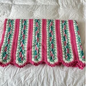 Crochet by hand Pink, Green, Blue and Cream Throw Blanket/ Afghan stripe with scalloped edge