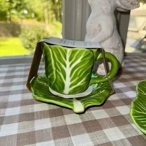 SOLD OUT! Viral on TikTok and Instagram! Charming teacup and saucer set with a cabbage green leaf design. Perfect for tea lovers, spring, Easter, and more. Minor imperfections may exist. Additional decor items such as rabbit and tablecloth not included. The listing is for one teacup and saucer set only.