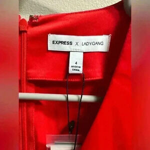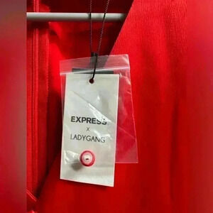 Stunning cherry red midi dress from the Express x Lady Gang collection, perfect for any special occasion. With its flattering A-line silhouette and luxe satin fabric, this dress is designed to make a statement. Brand new with tags and ready to elevate your wardrobe.