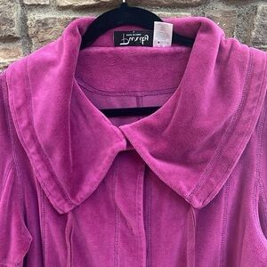 Purity fuchsia jacket with scrunched sleeves and zippered pockets. Size Large. Approximate measurements are 21 pit to pit and length from shoulder is 24