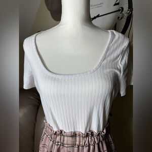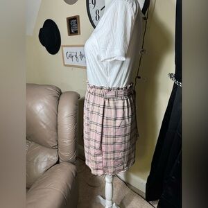 Chic plaid button-front skirt with connected top (dress) in a soft pink hue. Perfect for casual outings or a stylish day at work. Waist has stretch Preloved in great condition