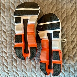 Stylish sneakers for sport or play with a light beige top and striking orange and white sole with black accents. Worn once. See pics for some adhesive residue from store sticker on insole. Would keep but they’re a tad bit snug on me. I wear an 8 but wish these were an 8.5, fyi! Sad 4 me but score 4 you! 🤩