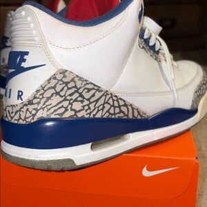 Air Jordan 3 Retro sneakers in white with blue and red accents. Iconic elephant print design. Size 11 men’s no box