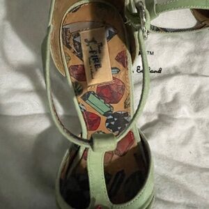 Deliciously adorable! Retro pinup! Platform heel sandal by Miss L Fire. EU 36/US 6. Mint green suede. Glitter platform and heel. Stunning crystal-coated strawberry on front. Includes dust bag.