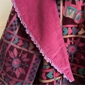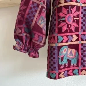 Such a neat blouse for your baby girl. Lots of vibrant colors and print design. Interchangeable scarf buttons under the back collar. Slight fading on the elephant print but overall such a unique piece to add to your daughter’s closet. Lightweight item.