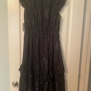 INC Women Dress Size L Deepest Navy Black Metallic Shiny Jacquard Ruffle V-Neck Cap Sleeve