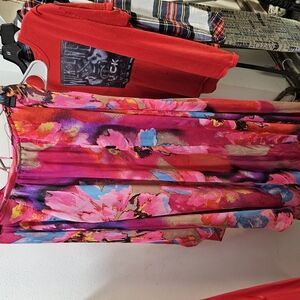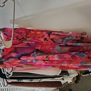 This vibrant sundress features a captivating blend of pink and red hues, perfect for a night out or resort wear. The dress is all connected to each other by small straps the waist is extremely stretchy and can fit any size from medium to xxl. The top bra part probably fits a 34-36 A or B cup perfectly. C cup still fits it's just a little bit tight. Worn once. Is sheer but once on and it's sitting on top of itself with the layers you can't see anything. I got so many compliments!