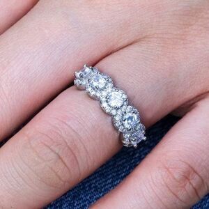 - Style: A classic round cut gemstone halo ring with five side-by-side main stones, brilliant a real diamond-like halo.