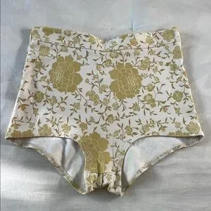 Chic high-waisted shorts with a floral pattern. Features a blend of cream and gold colors. 11.5 in across the waist & 12in across the hip.