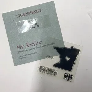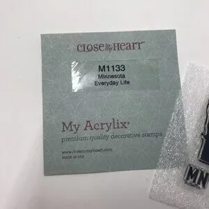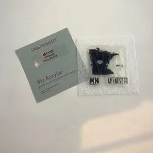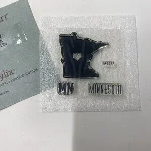 NEW Close To My Heart CTMH Mini Stamp Set M1133 Minnesota Everyday Life. Comes with the shape of Minnesota, MN and the word Minnesota. Total size is 3"x3". The shape of Minnesota is about 1 1/2' x 1 1/2". I do not have the plastic sleeve that this stamp originally came with. I never kept the because they took up too much space. They will come in a ziplock baggy. This is a new and never used stamp set.