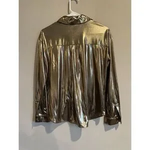 Add some retro glam to your wardrobe with this Anthropologie button-up top. The gold shimmer adds a touch of glamour to the classic design, making it perfect for any occasion. The long sleeves and regular size type ensure a comfortable fit, while the brand's reputation for quality guarantees that this top will last for years to come. The metal and retro themes make it a versatile addition to any outfit, and the size small makes it a great choice for women who want to add a touch of sophistication to their look.