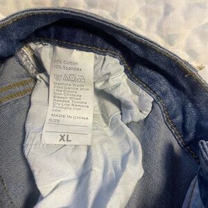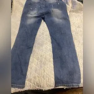 women boyfriend jeans ripped with snowman’s inside holes and writing on the bottom of both legs (misspelled) size XL
