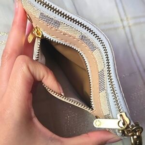 Pre-loved, White & Grey Damier Azur Checkered Key Pouch. (1) Zipper pocket & clasp. Pouch can be used as a coin purse or card holder. Not Authentic. "AS IS" condition. Minor flaws & measurements are shown in photos.