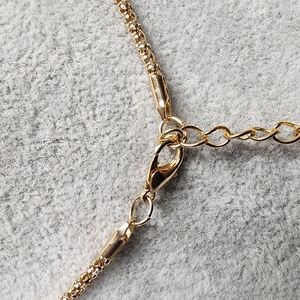 This exquisite necklace showcases a substantial rectangular pendant with blue rhinestones for added texture to the surface, blending a vibrant gold hue. The pendant has lobsterclaw style clasp and is suspended from a delicate gold chain, creating a captivating fun piece. Measures 24" plus 3" extender.
