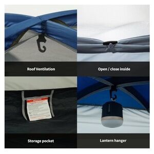 Spacious tent in navy blue and gray. Ideal for camping trips.