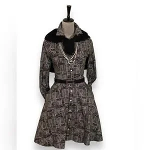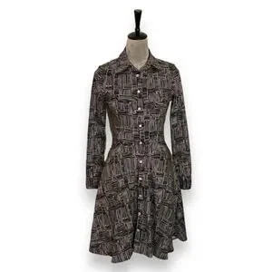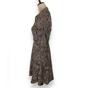 Features: Classic shirt collar, Button-down front, Cinched waist, A-line skirt, Geometric pattern, Lightweight, breathable fabric